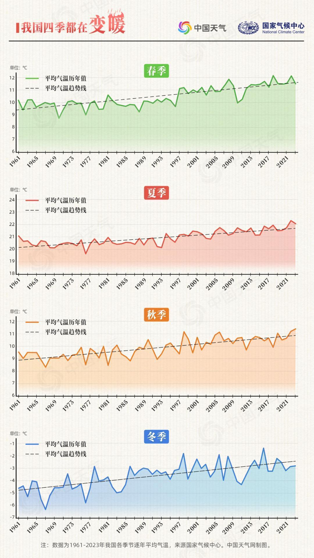 事实上,不止冬春回暖,我国春、夏、秋、冬四个季节也都在变暖。据2024年世界气象组织(WMO)发布的报告显示,我国最暖的春季和夏季均出现在2022年,最暖的秋季出现在2023年,最暖的冬季则出现在2016年。